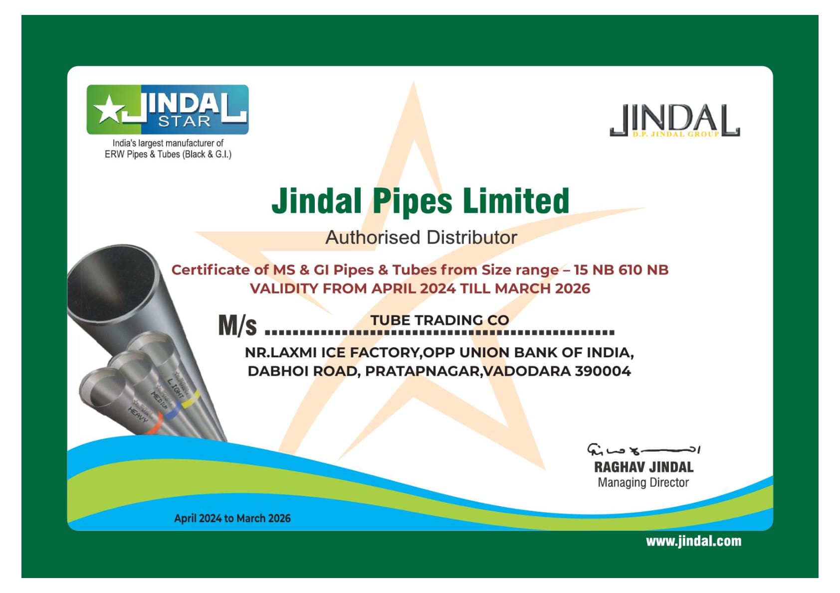 We are pleased to introduce ourselves as a stockist / Distributor of all varieties of Jindal pipes in Vadodara, Gujarat. We are in the market for the last 30 years and we supply to almost 1000+ reputed Companies in India (Gujarat, Maharashtra, Rajasthan, Madhya Pradesh, Daman, Uttar Pradesh etc.).